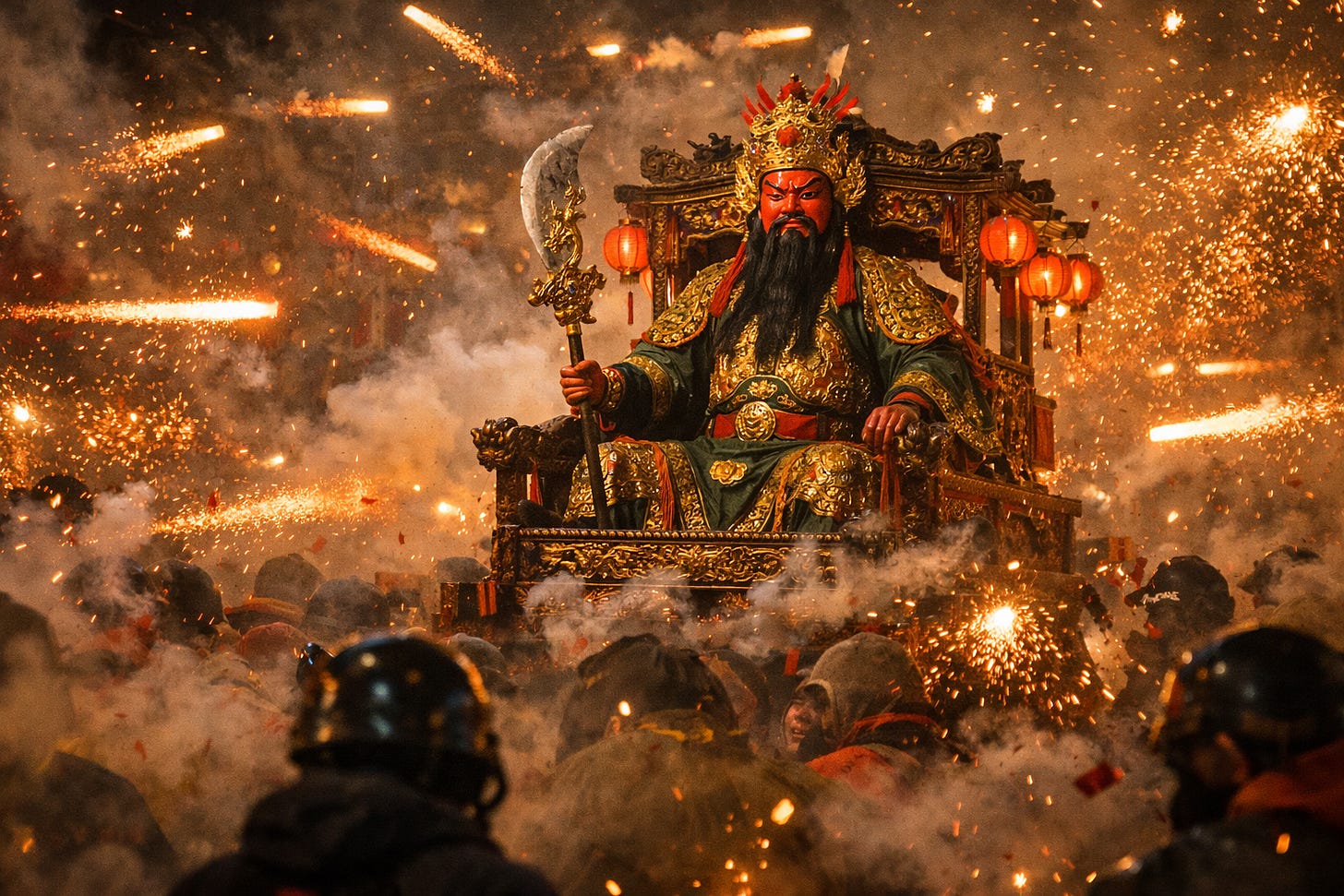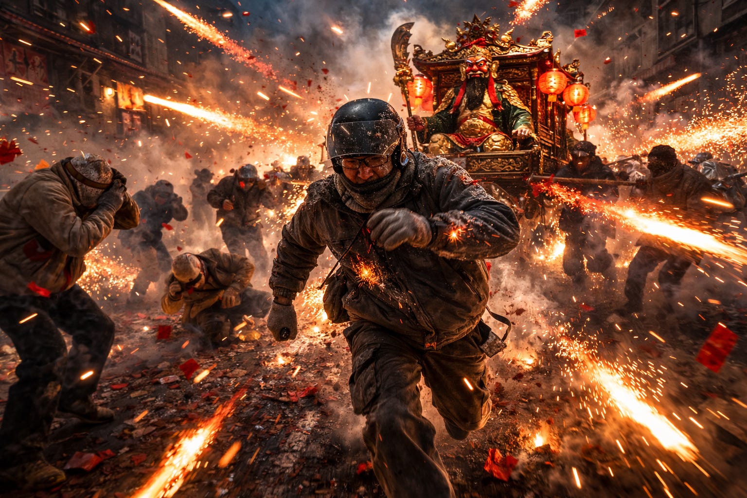接著,他看見「他」在煙霧和光束中顯現。那畫面如夢似幻:紅面將軍留著飄揚的黑長鬍鬚,坐在木製神轎上,由眾人抬著在街道上緩緩前行。火箭在他身邊穿梭,火花如雨般落下。神轎下方的人們倒下、呼喊,並尋找掩護。