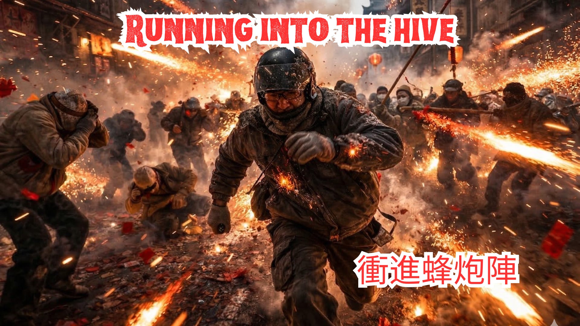 More blasts tear across the street. The god rides on. The man runs on. Into the chaos of explosions, sparks and smoke. Into the unknown. In Yanshui. In the beehive fireworks.